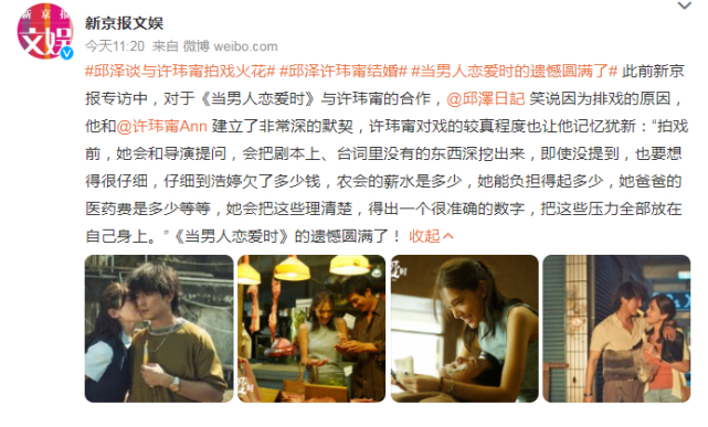 虽然一部分网友感到困惑,但也有一部分“CP党”欢欣鼓舞,在今年六月份,由邱泽与许玮甯共同主演的爱情电影《当男人恋爱时》上映之后,因为两人在电影中虐心又甜蜜的爱情故事牢牢地圈了一波粉丝,邱泽和许玮甯在电影上映之后依旧保持着非常密切的联系。