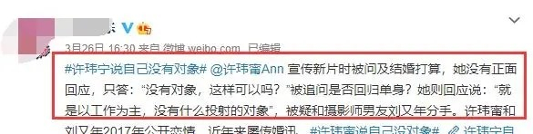 在《当男人恋爱时》的宣传期间,他们依旧延续了自己在电影中的CP感,而许玮甯也第一次对着记者的镜头承认了自己的婚变传闻,她曾经与摄影师刘又年低调恋爱四年,在今年3月份参加活动的时候,面对记者“什么时候好事将近”的询问,苦涩地表示自己暂时没有对象,当时大家都以为她只是分手而已。