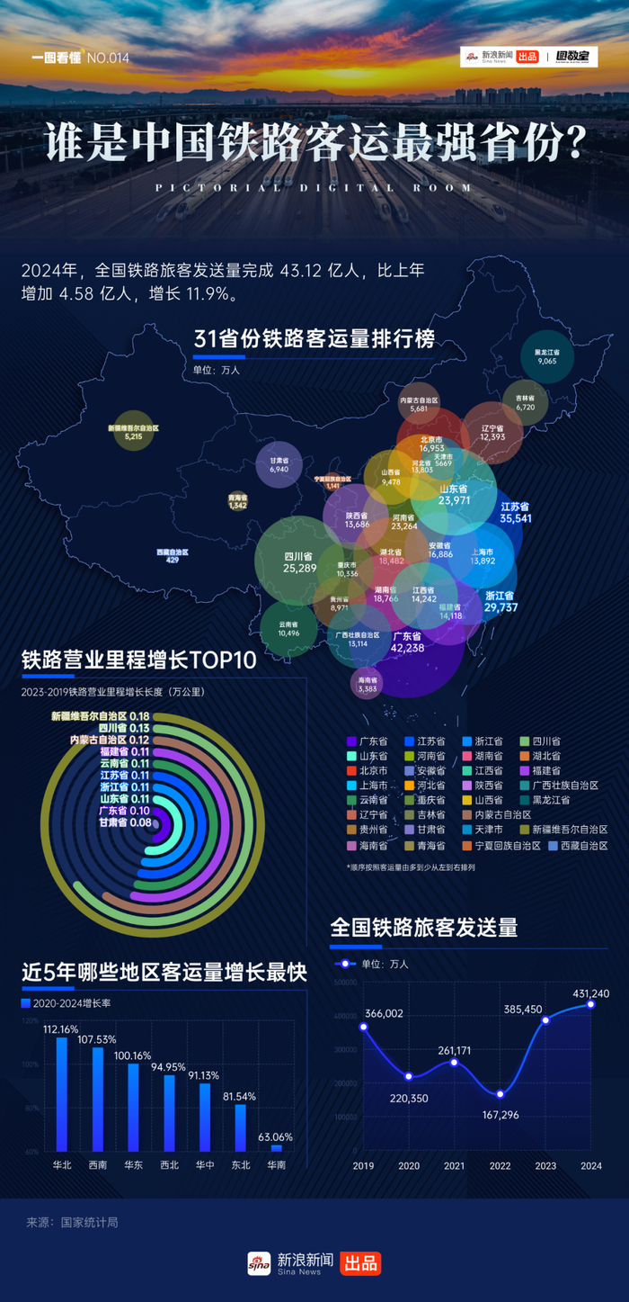 2024年,全国铁路旅客发送量达到43.12亿人,较上年增长11.9%。在这一整体向好的趋势下,各省份的也交出不同的“成绩单”。