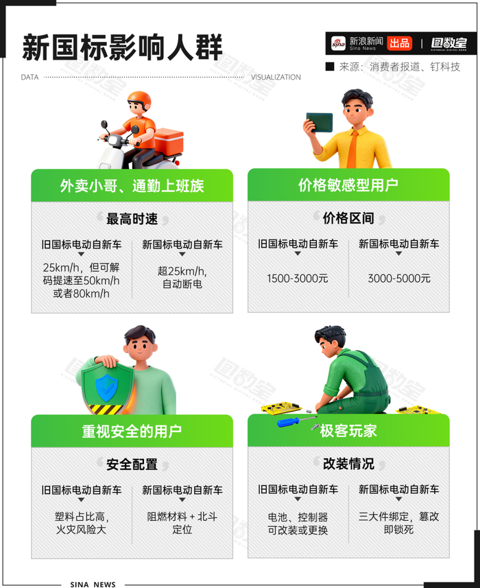 然而,新国标车规定最高车速不超过25km/h,还引入超速断电、防篡改机制,一方面增强车辆安全性,另一方面将直接影响通勤和外卖员等群体的骑行效率。不过,铅酸电池车型的整车质量上限由55kg提高至63kg,使其可配备更大电池,续航预计能增加15-20公里。