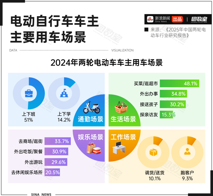 调研显示,通勤和生活出行是大多数车主的主要用车场景:约一半用户依赖两轮电动自行车上下班、购物,他们对电动自行车的核心需求在于经济、便捷与可靠。