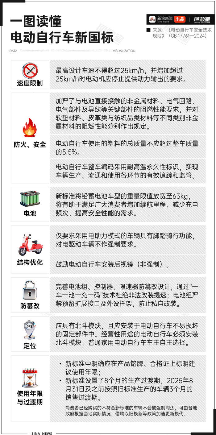 2025年12月1日起,新国标《电动自行车安全技术规范》全面落地实施,不符合新规的“旧国标”车将全面停售。新国标在电动自行车速度、车辆防火阻燃、塑料占比等方面都做出了更严格的规定。