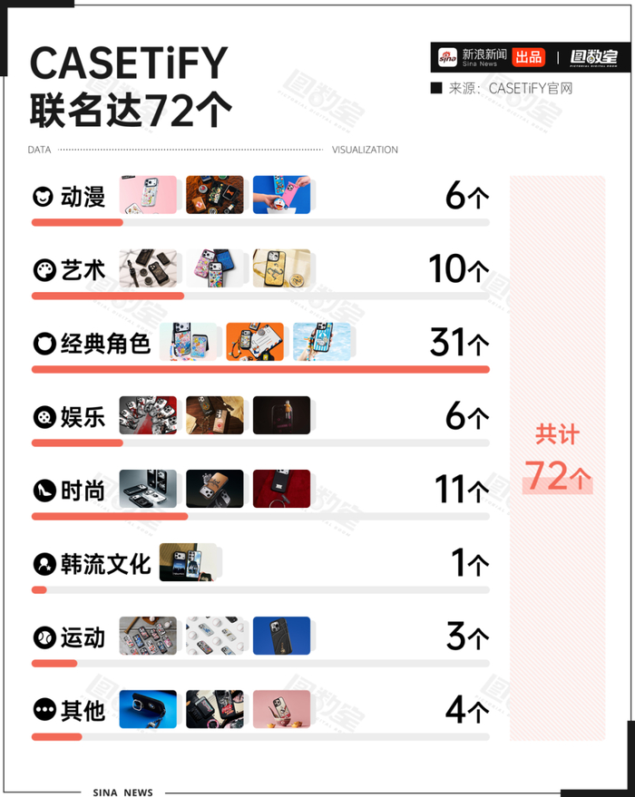 图数室通过查询CASETiFY官方网站,发现网站在售联名手机壳多达72个,共计8个分类。不仅与知名动漫、经典角色联名,还与韩流文化、运动等多个领域跨界合作。