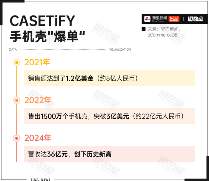 CASETiFY正是抓住了这种转变。创始人吴培燊曾对外透露,CASETiFY年均手机壳销售超300万件,成立10年来每年都保持倍数式增长。公开数据显示,2021年CASETiFY营收达到了1.2亿美元,销量超过300万件,次年CASETiFY在天猫平台开业首日,销售额就突破百万元;2024年营收达36亿元,创下历史新高。