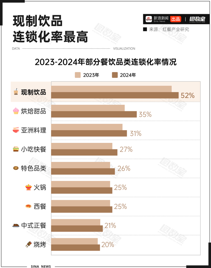 现制饮品成为餐饮业态中连锁化率最高的品类。据红餐产业研究,2024年,国内现制饮品连锁化率高达52%,把第二名的烘焙甜品(35%)甩出一大截。