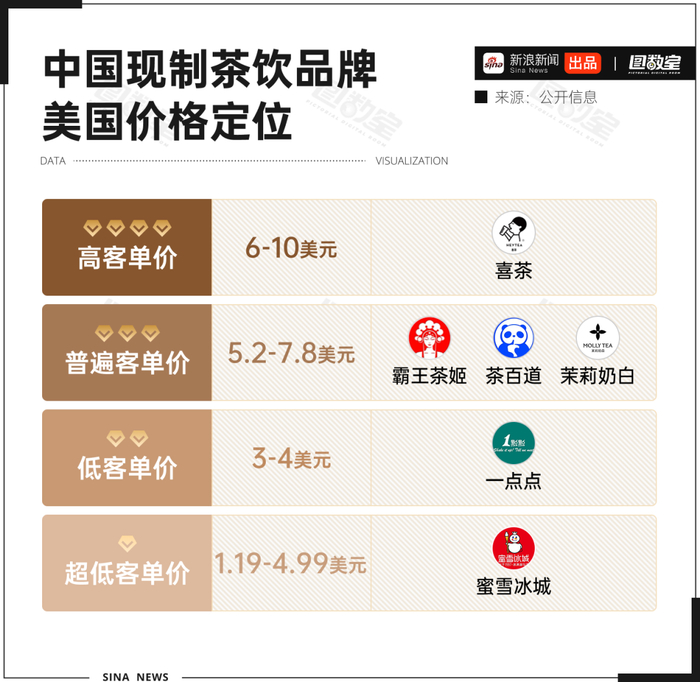 图数室据公开信息整理发现,当前出海的中国茶饮品牌,通过差异化的定价,形成了覆盖高、中、低、超低四个层级市场的格局。