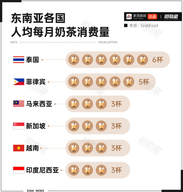 有数据显示,仅在东南亚主流外卖平台GrabFood上,平均每位用户每月就会购买4杯珍珠奶茶。其中,泰国消费者的热情尤为突出,月均消费量比该平台平均水平高出2杯;紧随其后的菲律宾消费者,平均每人每月也要喝掉5杯奶茶。