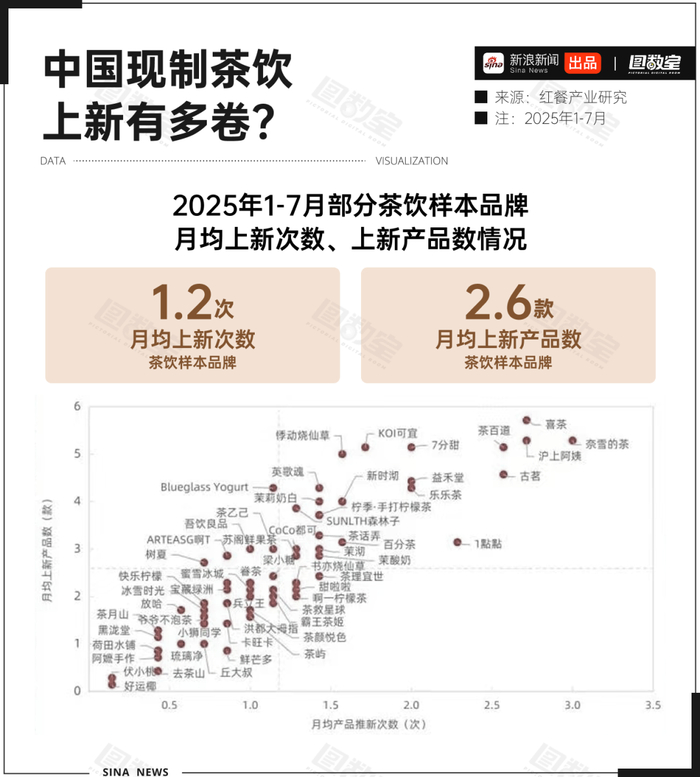而在大后方,作为全球最大的茶饮消费市场,国内新茶饮品牌展现出强劲的研发与运营实力。行业数据显示,2025年1-7月主流品牌平均每月上新约1.2次、推出2.6款新品,形成稳定的产品迭代节奏。