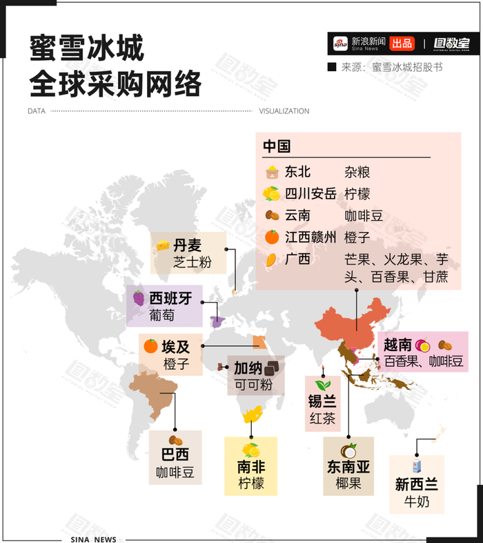 就以蜜雪冰城为例,目前,蜜雪冰城在河南、海南、广西、重庆、安徽拥有五大生产基地,糖、奶、茶、咖、果、粮、料全都自产自足。同时,蜜雪冰城的采购网络已覆盖全球六大洲、38个国家。