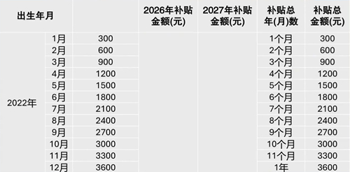 补贴标准为每孩每年3600元,按年计算,每年一次性发放。其中对2022年到2024年期间出生的孩子,要按应补贴月份折算补贴金额。具体金额见表格: