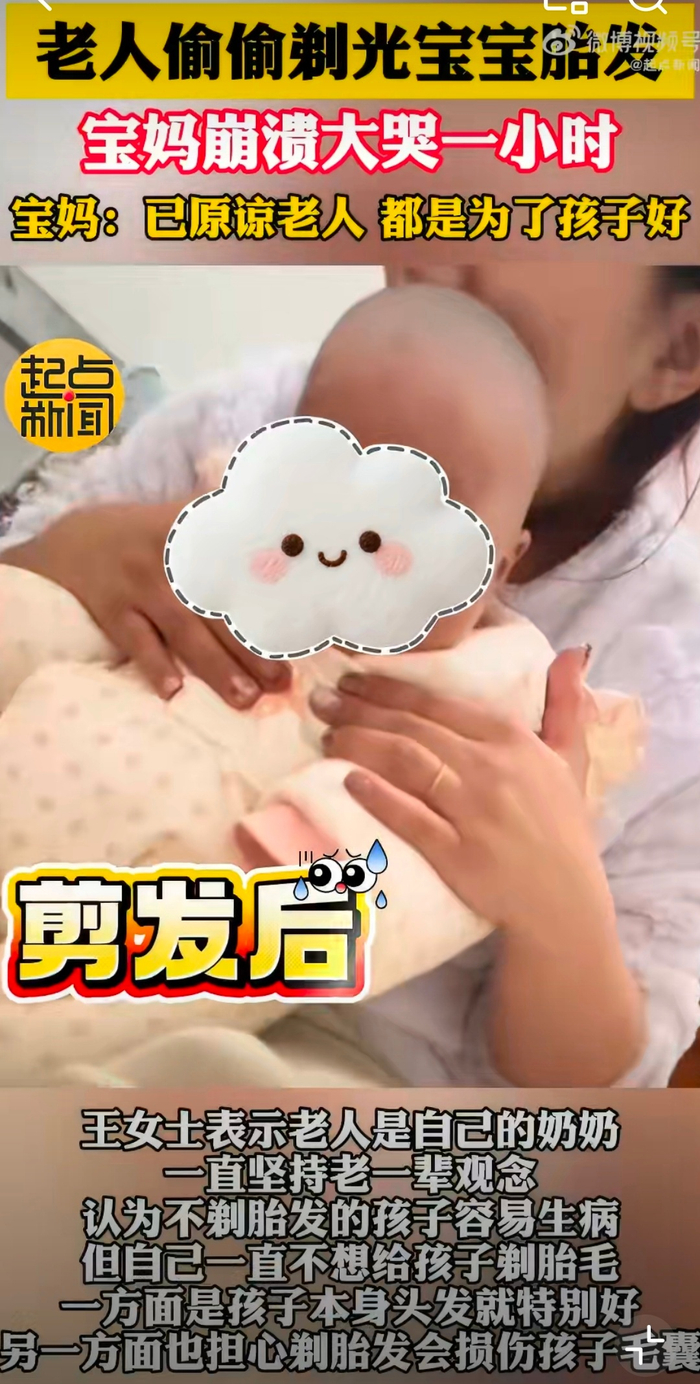 老人偷剃婴儿胎发致感染风险宝妈痛哭