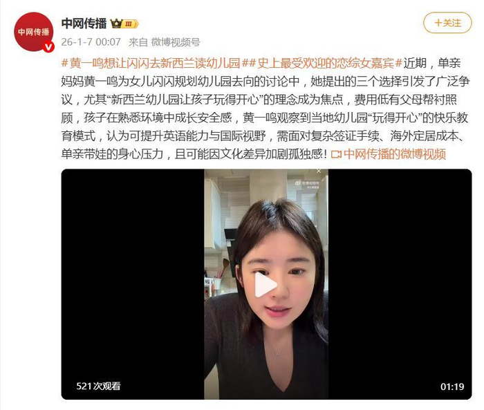据1月6日报道,单亲妈妈黄一鸣在直播里为女儿闪闪的幼儿园去向犯了难,她抛出的三个选项——安庆、杭州、新西兰,瞬间在评论区炸开了锅。尤其是第三个“去新西兰读幼儿园”,一句“我看那边小孩子玩得挺开心的”,直接让这场育儿选择升级成了关于教育理念、经济实力和单亲妈妈极限挑战的网友辩论。