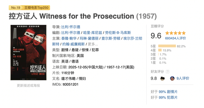 《控方证人》由“推理女王”阿加莎·克里斯蒂原著改编,奥斯卡导演比利·怀尔德执导,上映于1957年。在长达近70年的时间里,无数影迷曾为这个精巧缜密又震慑人心的故事所折服,豆瓣评分高达9.6,是当之无愧的影史悬疑巅峰之作,而此次放映也将是该片首次以中文配音版形式登陆全国院线。