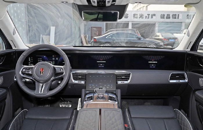进入车内,不仅中控台上有三联屏,扶手箱区域还有一块更多控制功能的显示屏,包括真皮方向盘、遥控泊车、多屏互动、全景天窗、电动尾门以及感应雨刷等等,相当丰富。