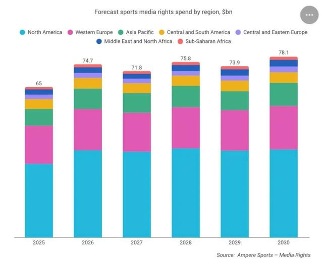据分析机构Ampere 11月底发布的预测报告显示,到2030年全球体育版权费用将超过780亿美元,对比2025年的650亿增长20%。
