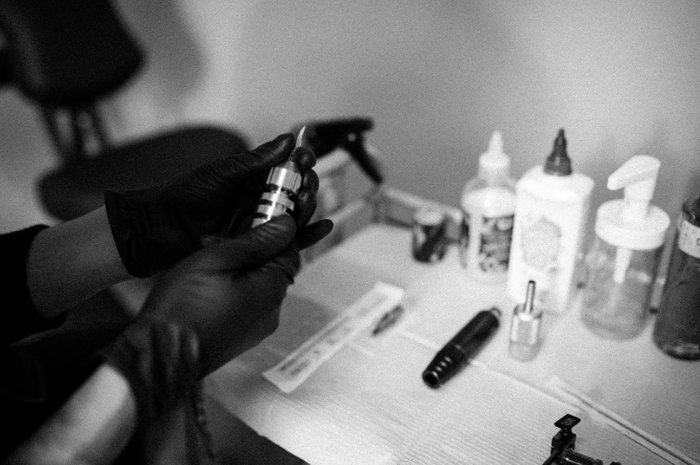 3 / 6 和小哥交流,小哥创业好几年,目前辛苦的创业!了解到他目前是文身师,因为热爱,创立朝壹文身店,图片是他在装针。