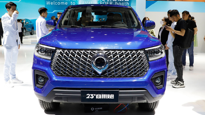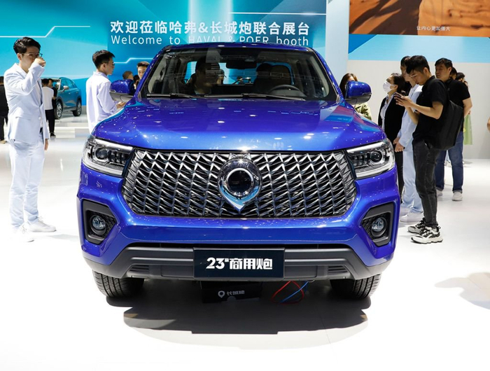 先说长城商用炮,其外观造型基本延续前代设计,主要变化是中网换成了“V”字型设计,并加装镀铬元素,提升前脸的精致感。两翼头灯造型方正,与进气格栅紧密契合,拉伸前脸的气势感。前包围造型厚重,并通过两根线条,来营造层次效果。