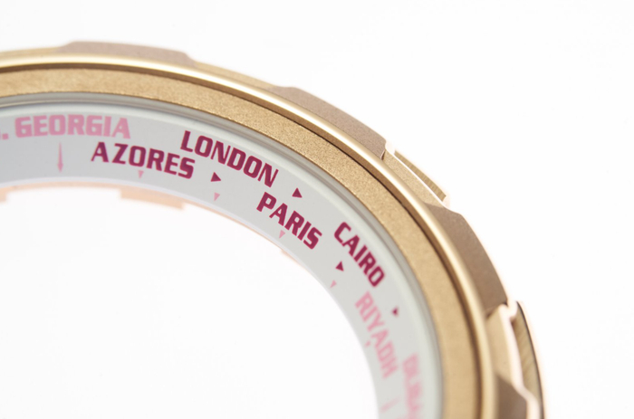 经微喷砂处理的5N红金表圈搭载滚珠轴承结构,旅行者通过轻旋表圈选定城市,即可瞬间切换目标时区。集成于表圈内部的齿轮机构与时针轮联动,同步将12点钟方位城市的本地时间设为基准,随之更新表圈其余23座城市时间。透过饰有24小时刻度的内法兰盘,佩戴者可轻松读取全球时间。玫瑰粉与勃艮第红双色显示盘自动区分昼夜,随各时区切换精准适配。