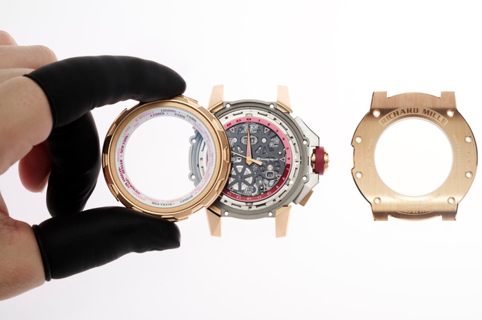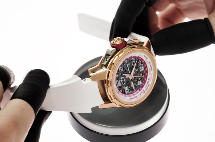 RM 63-02搭载直径47毫米、厚度13.45毫米的圆形表壳,由丝光打磨5N红金经铣削成型,辅以抛光斜角处理,中层表壳采用五级钛合金打造,其表面润饰与正面完美呼应。优雅廓形兼顾人性化操作与全天候舒适佩戴体验,底盖经品牌标志性的多重弧度铣削工艺雕饰。三件式表壳内含106枚零件,其中12枚零件专为驱动世界时表圈而生,另有86枚CRMA4机芯零件协同实现此精密时区机制。