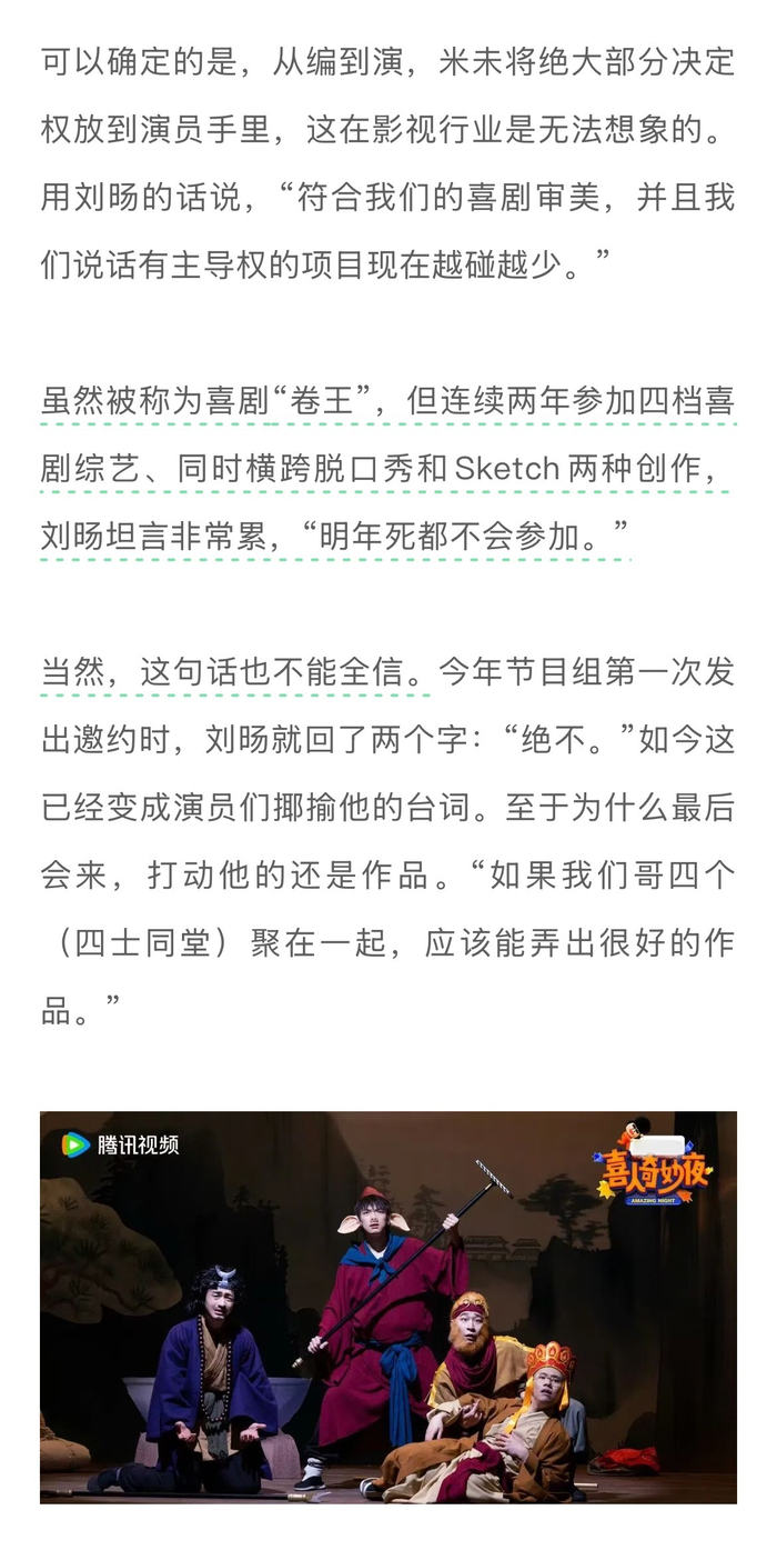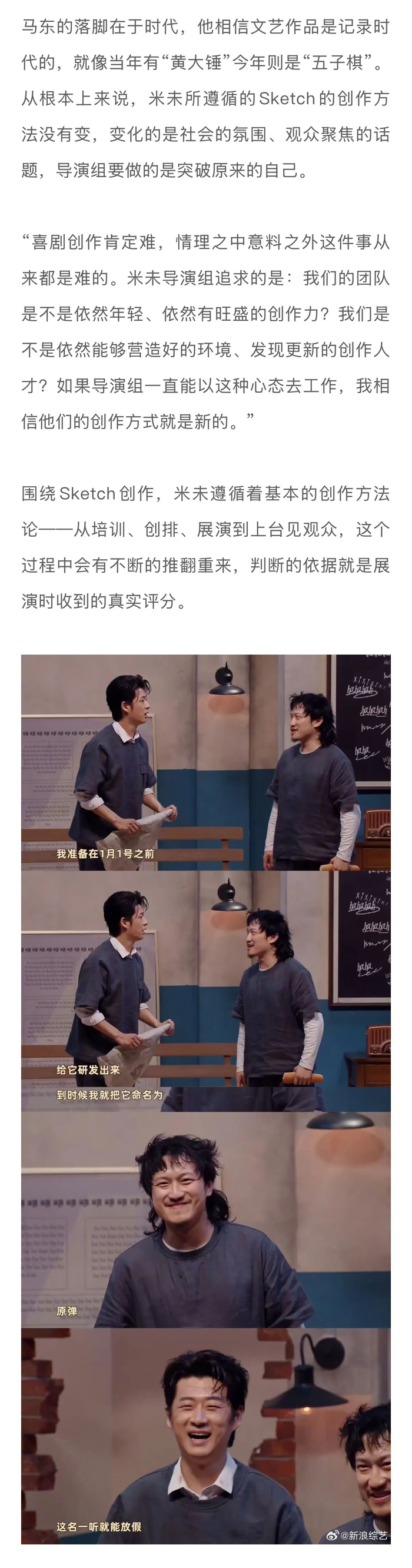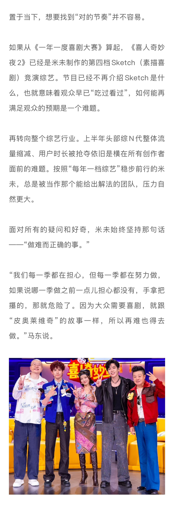 #土豆刘旸蒋龙张弛回应为何回喜夜2##技能五子棋在这个时代是对的# 如果从《一年一度喜剧大赛》算起,《喜人奇妙夜2》已经是米未制作的第四档Sketch(素描喜剧)竞演综艺。面对面对疑问和好奇,米未传媒CEO马东回应表示:“我们每一季都在担心,但每一季都在努力做,如果说哪一季做之前一点儿担心都没有,手拿把攥的,那就危险了。因为大众需要喜剧,就跟“皮奥莱维奇”的故事一样,所以再难也得去做。”