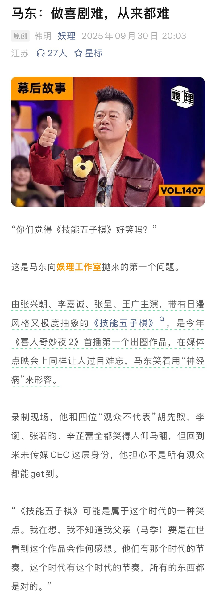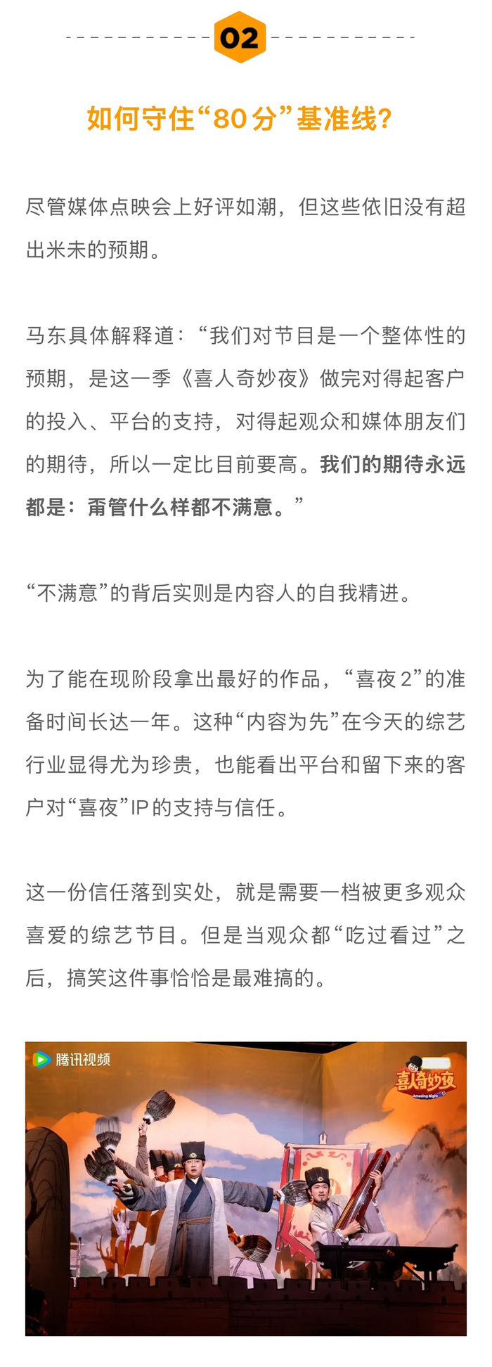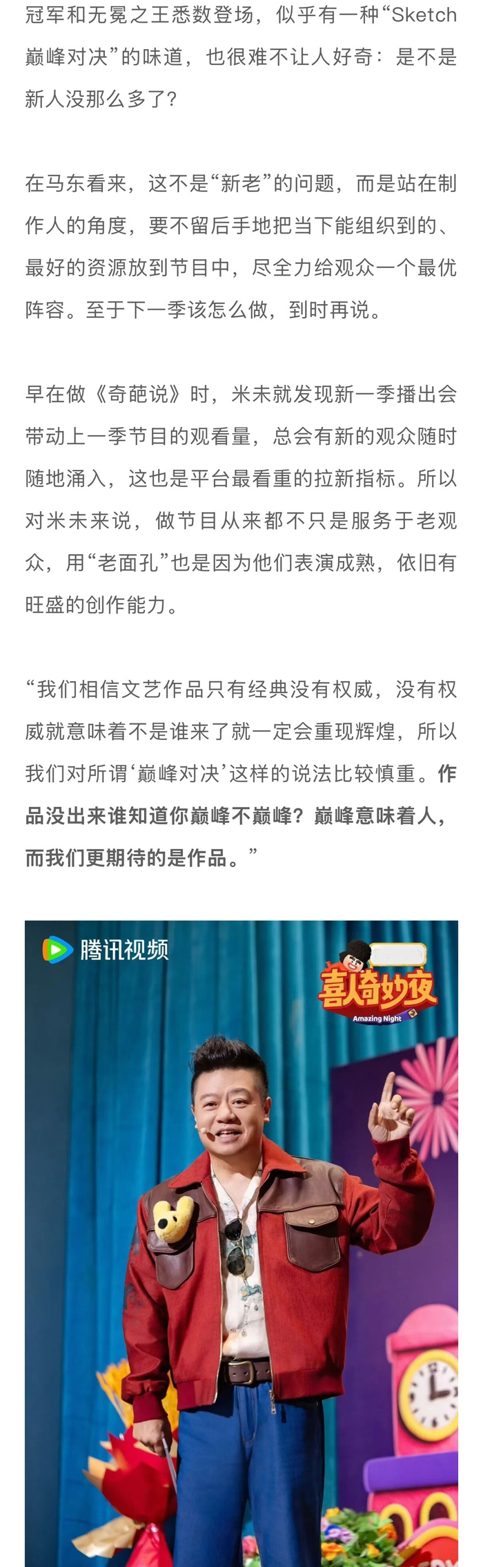 #土豆刘旸蒋龙张弛回应为何回喜夜2##技能五子棋在这个时代是对的# 如果从《一年一度喜剧大赛》算起,《喜人奇妙夜2》已经是米未制作的第四档Sketch(素描喜剧)竞演综艺。面对面对疑问和好奇,米未传媒CEO马东回应表示:“我们每一季都在担心,但每一季都在努力做,如果说哪一季做之前一点儿担心都没有,手拿把攥的,那就危险了。因为大众需要喜剧,就跟“皮奥莱维奇”的故事一样,所以再难也得去做。”