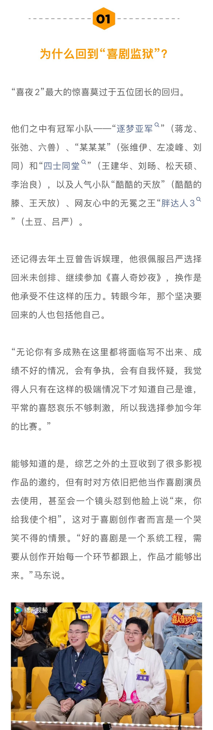今年的《喜剧奇妙夜2》最大的惊喜莫过于五位团长的回归。去年土豆曾告诉娱理,他很佩服吕严选择回米未创排、继续参加《喜人奇妙夜》,换作是他承受不住这样的压力。转眼今年,那个坚决要回来的人也包括他自己。推掉其它邀约,回到“喜夜2”的还有“卷王”刘旸和蒋龙、张弛…#大咖茶话会#↓
