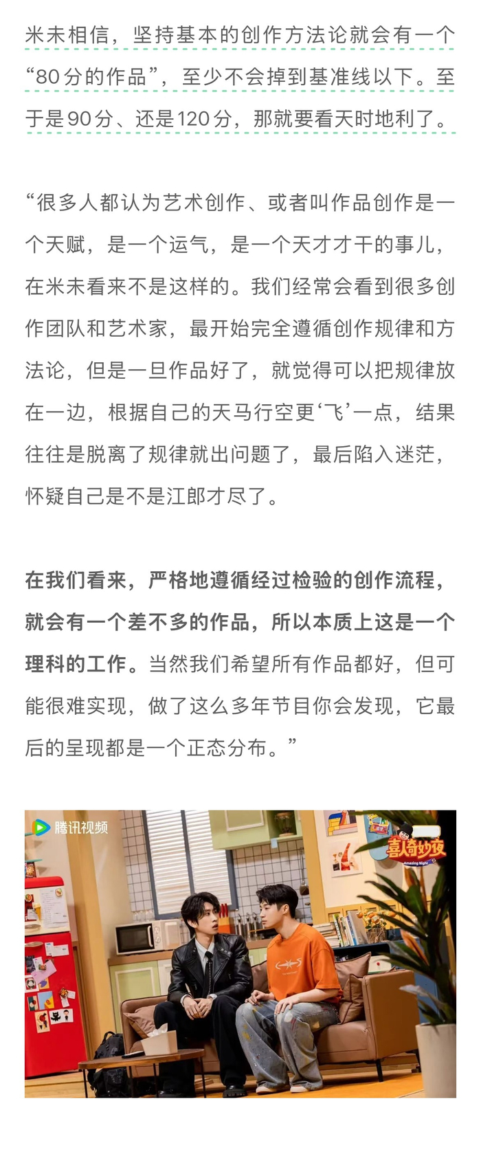 早先新浪娱乐@娱理 工作室曾向马东发问:“一年时间全部投入在一档节目上,会不会风险太大?”他很快回答道“米未活得很好。”“我们的方法论叫做‘智力总投入’。这个公式是聪明的头脑乘以足够长的时间,再一起除以集中度,等于内容质量。所以除以1是一件划算的事情,除以2就会被稀释,除以4就等着死。”