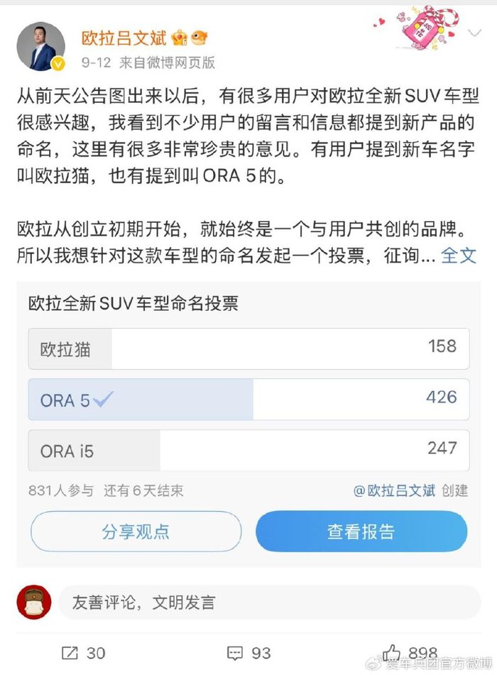 9月12日,吕文斌见到网友们兴趣如此之高,便再次在社交平台发起投票话题要和用户共创,随之欧拉汽车官方平台转发该投票信息,和网友一起参与欧拉全新SUV命名讨论。
