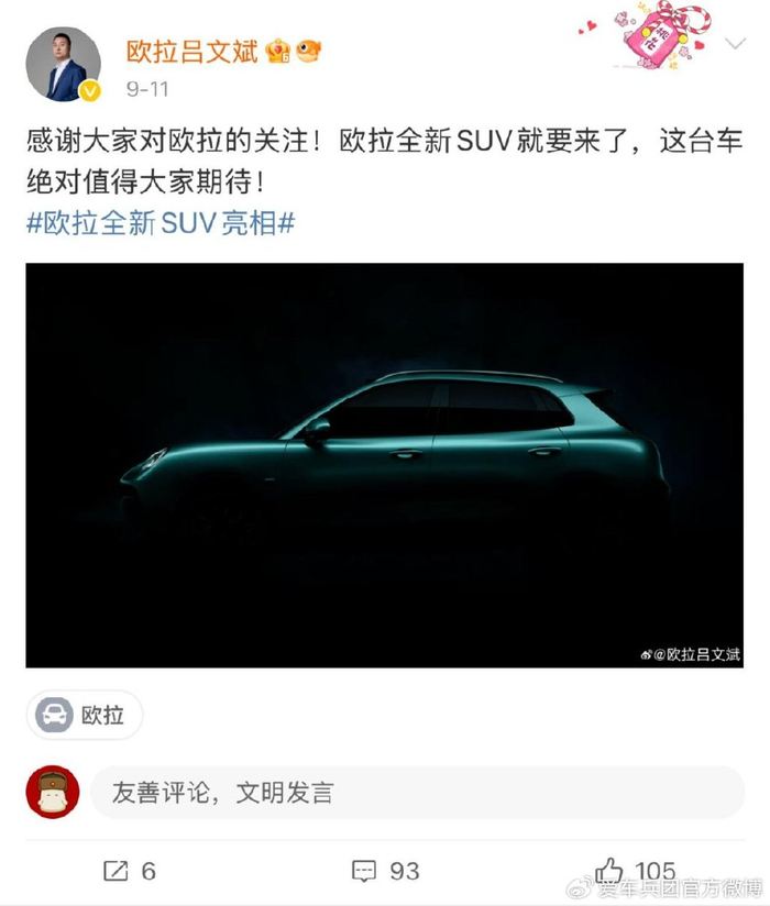 9月10日,工信部网站公示欧拉全新SUV申报图及关键信息。紧接着,欧拉品牌总经理吕文斌就在社交平台发布了一张欧拉全新SUV的侧面线条图,并配文“感谢大家对欧拉的关注!欧拉全新SUV就要来了,这台车绝对值得大家期待!”