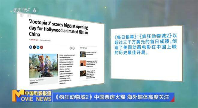 英国权威电影媒体《每日银幕》报道《疯狂动物城2》以超过三千万美元的首日成绩,创造了美国动画电影在中国上映的历史最佳开局。