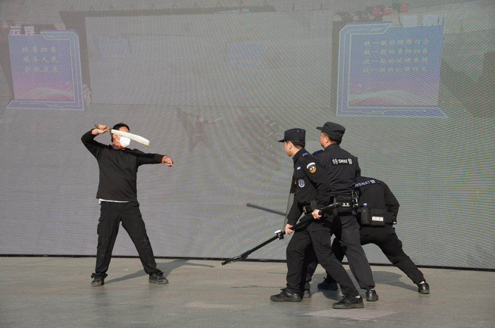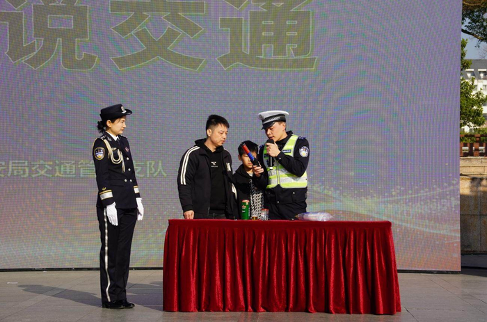三名手持警械的警员默契配合,迅速将“歹徒”制服交警小梁的登场将现场气氛推向轻松愉悦的高潮。这位在市民中拥有不少“粉丝”的交警,用幽默风趣的语言与主动上台的市民互动,演示饮酒后酒精监测仪的实测数据。“大家看,这位市民只是喝了一小口啤酒,数值就已经超过安全标准了。”小梁边演示边讲解,“开车不喝酒,喝酒不开车,这是对自己和他人生命的负责。”
