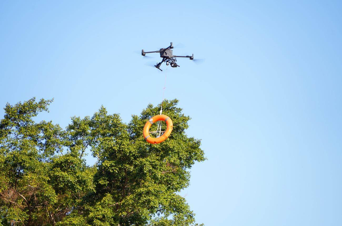 救援无人机迅速飞赴模拟落水区域,精准投下救生圈至“落水者”身旁 云浮市公安局供图