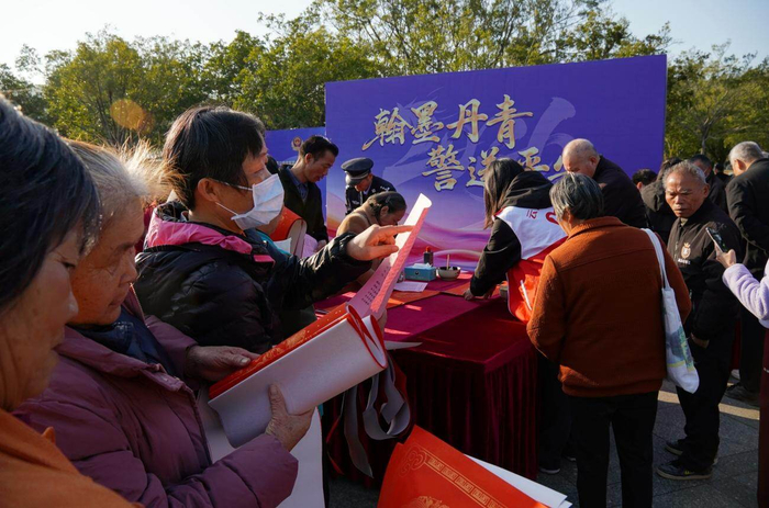 活动现场还设置了集章礼品兑换、互动拍照打卡、激光枪射击体验等互动环节。写春联送平安活动摊位前排起了长队,民警与书法爱好者一起挥毫泼墨,将新春祝福与平安理念融入一副副对联中。