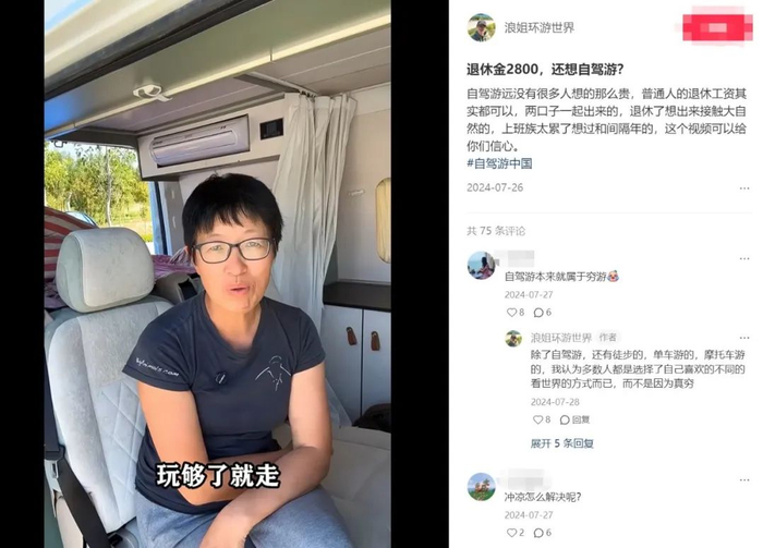 这位旅游达人叫浪姐,网名“浪姐环游世界”,她的自我介绍是这样的“2023年退休到处浪,曾一个人走过51个国家和地区”,经历也是非常丰富,在去年开着她的“浪小白”自驾游了5个月,最后归途是哈尔滨到东莞,然后顺便解锁了三个她还没去过的省级行政区天津、山西、河南,从而完成了全国大满贯成就。