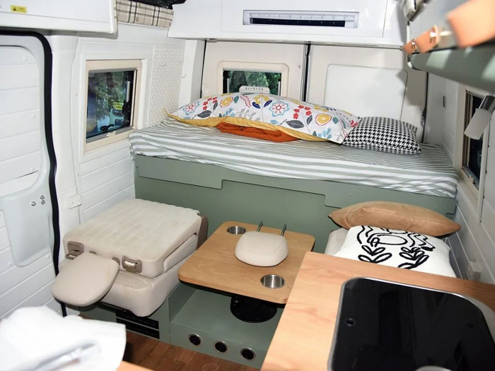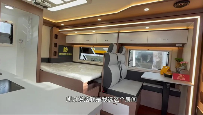 升顶后,车厢内部情况如下图,一张大床位于前部,中间则是桌椅组合,这里也可变为第二张床,然后门、厨卫设施则在尾部,功能性方面丝毫不弱于C型房车。