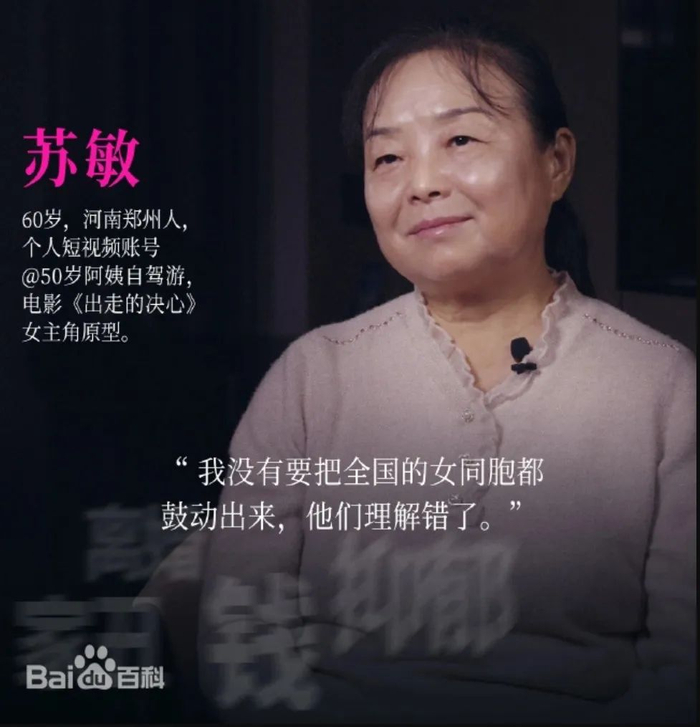 苏敏阿姨可能是当下最火的自驾游博主了,以她的故事改编的电影《出走的决心》已在去年上映,上个月主创团队以及她还在戛纳电影节亮相,她从一个被禁锢在琐碎生活中的家庭主妇,蜕变成了一个真正掌握自己命运的61岁退休阿姨榜样,她让很多人懂得了生活的真谛是什么。