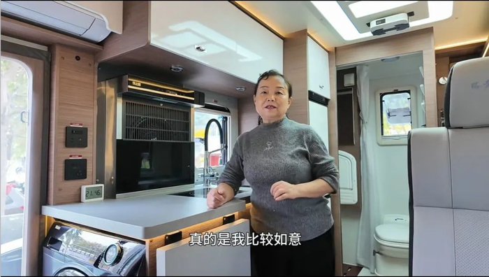 她自驾游已超过五年,也用过多款车,而这辆自行式房车是她今年刚换的,路壳房车根据其要求对车内设备和布局都做了定制化处理,让她放下了一个8公斤的滚筒洗衣机,还有多挡位的抽油烟机,生活便利性更佳。