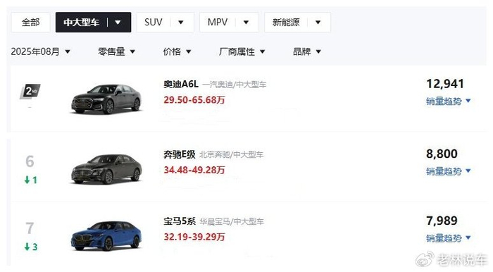 销量方面,在56E三款车型中,销量表现最好的是奥迪A6L,以8月份销量为例,奥迪A6L卖出了12941台,奔驰E级卖出了8800台,宝马5系卖出了7989台。明明奔驰E级的优惠力度很大,为什么卖不过奥迪A6L呢?
