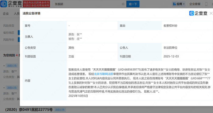 【#诽谤张靓颖赔钱货网友公开道歉#】#网民诽谤张靓颖是小三被判道歉#企查查APP显示,近日,庄某某就发表诽谤、贬损@张靓颖 的不当言论公开致歉,此前,其曾公开发表“赔钱货张靓颖”、“张靓颖是3”等言论。