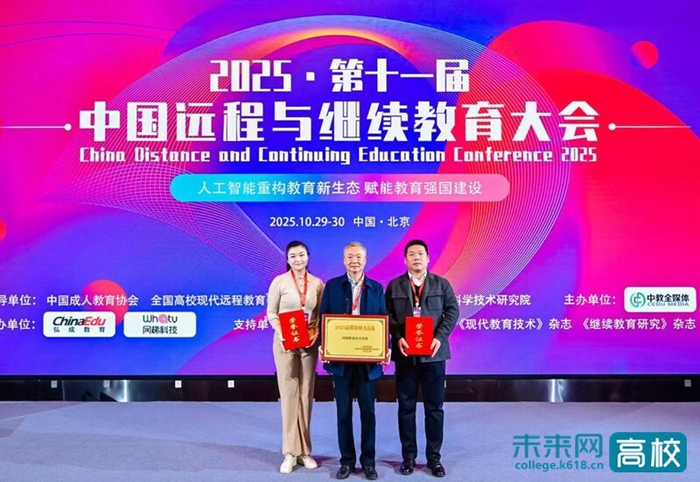 10月29日至30日,第十一届中国高校远程与继续教育大会在北京召开。本届大会以“人工智能重构教育新生态 赋能教育强国建设”为主题,来自全国各地高校、开放大学、教育企业、行业协会、专业媒体等千余位嘉宾和代表相聚北京,共商远程教育与继续教育质量提升新路径。大会公布了有关荣誉奖项,河南职业技术学院获“品牌影响力高校”和两项优秀案例奖。河南职业技术学院党委委员、副校长李玉峰带领继续教育学院负责人参会。
