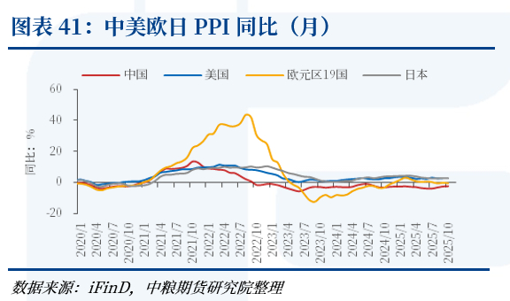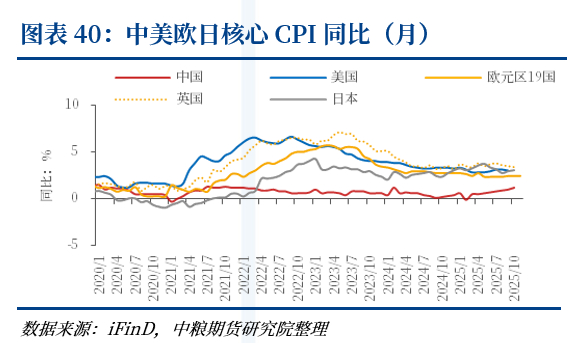 与之呼应,最新可得的10月PPI同比已由负转正至0.1%(前值-0.1%),显示工业品价格阶段性企稳;机构对11月非能源PPI仍预计-0.1%环比、0.8%同比,短期成本端对通胀的再加压有限。(详见 图表39-41)