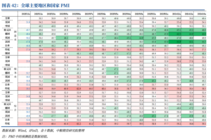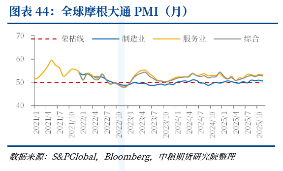 2025年11月,全球经济延续了“制造冷、服务暖”的显著分化格局;全球摩根大通制造业PMI录得50.5%(前值50.9%,复苏基础尚不稳固,服务业PMI录得53.3。