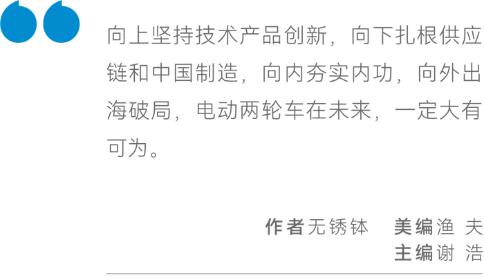 向上坚持技术产品创新,向下扎根供应链和中国制造,向内夯实内功,向外出海破局,电动两轮车在未来,一定大有可为。
