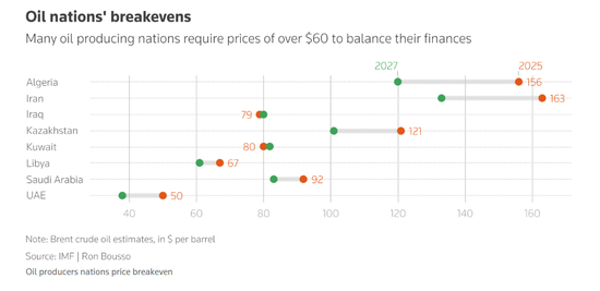 许多欧佩克产油国需要远高于当前区间的油价才能平衡国家财政。根据国际货币基金组织(IMF)的数据,沙特的财政盈亏平衡价高达每桶92美元。