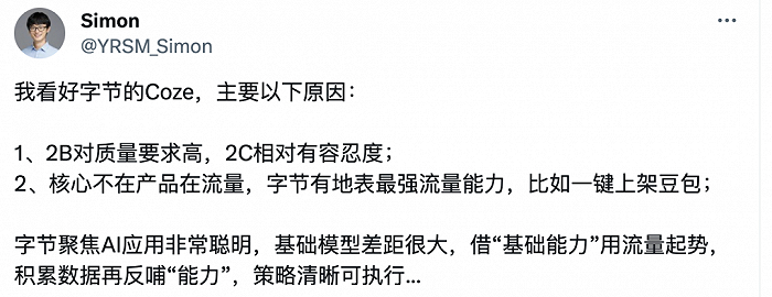 而对于扣子的发布,部分网友表示非常看好。原因之一是2B产品对质量要求高,2C产品市场相对有容忍度,二是核心不在产品在流量,字节有地表最强流量能力,比如一键上架豆包。在他看来,字节聚焦AI应用非常聪明,基础模型差距很大,借基础能力用流量起势,积累数据再反哺能力,策略清晰可执行。