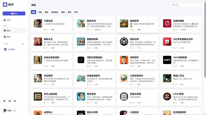 除此之外,扣子官方还提供了Bots商店和插件。截至目前,Bot商店已有30多款不同的应用,涵盖工具、娱乐、咨询、创意等类目,可以提供卡通头像生成、简历诊断、文案输出等能力。因此,扣子也被外界称为是“平替版GPTs商店”。