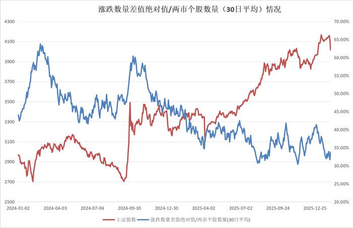 界面新闻统计发现,2024年以来,A股涨跌数量差值绝对值(上涨数量-下跌数量)/两市个股数量的(30日平均)的中枢从2024年50%左右下降到2026年30%左右,这说明当前的市场环境下,个股同涨同跌的现象越来越少,上涨股票数量和下跌股票数量越来越处于对冲的状态,使得大盘的整体波动在逐步减少,指数越来越趋向稳定。