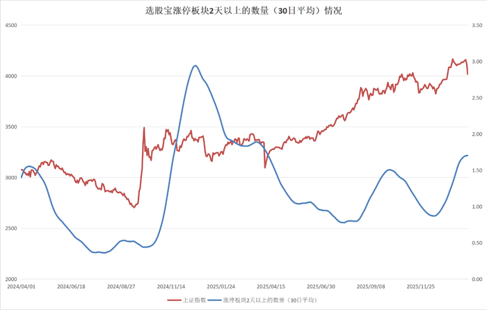 界面新闻统计了2024年以来选股宝涨停板块持续2天以上的板块数量(30日平均)情况,可以看出,自2025年4月以来虽然上证指数屡创新高,但是上述指标的数值多数时间都在1-1.5之间,与2024年4月、5月份的数据相差不多,这也说明市场短线的投机环境实际上是非常恶劣的。