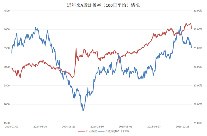 图:选股宝涨停板块持续2天以上的板块数量(30日平均)情况数据来源:选股宝、界面新闻整理界面新闻进一步统计了2024年以来炸板率的100日平均情况,可以看出,在2024年11月份的“疯牛”行情结束以后,市场的炸板率是在不断升高的,说明短线投机的波动越来越大。