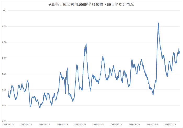 界面新闻统计了最近十年A股每日成交额前100个股的振幅(30日平均)情况,数据显示,上述指标的振幅中枢是在不断往上移动的,从2016年的约5%移动到当前的约7%,整体上移了大约2个百分点。这说明个股日内走势波动性加剧。